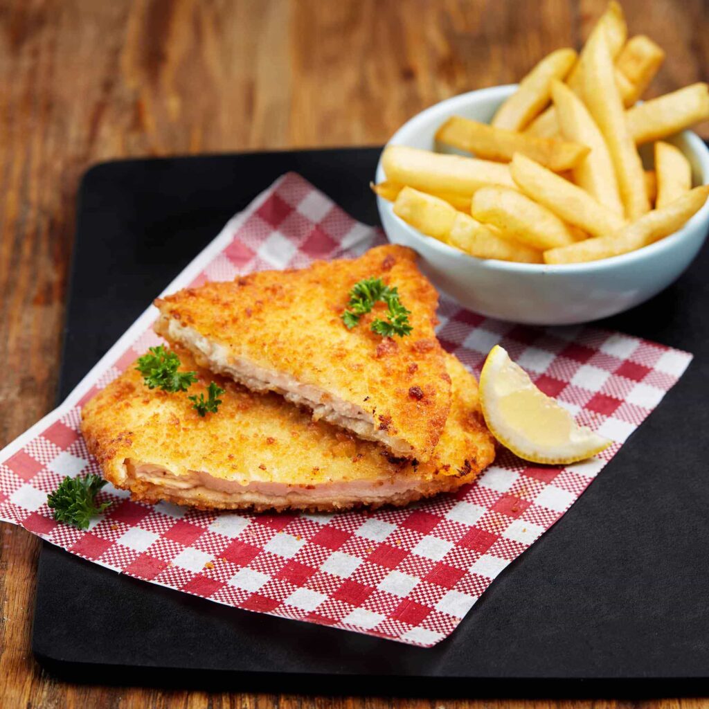 Schnitzel & Chips: Enjoy a crispy chicken breast schnitzel cooked to perfection, served with regular chips Perfect for those who love boneless chicken.